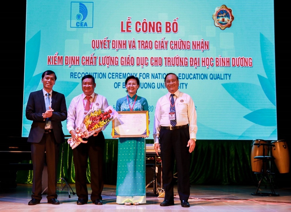Ngày 20/6/2018, Trung tâm Kiểm định chất lượng giáo dục thuộc Đại học Đà Nẵng đã trao Giấy chứng nhận đạt chuẩn kiểm định chất lượng giáo dục cho Trường Đại học Bình Dương sau khi đã trải qua vòng khảo sát sơ bộ, khảo sát chính thức với đầy đủ các tiêu chí của bộ tiêu chuẩn đánh giá, qua đây Nhà trường vinh dự trở thành một trong những cơ sở giáo dục đại học đầu tiên của tỉnh Bình Dương đạt chuẩn kiểm định chất lượng giáo dục theo quy định của Bộ GD&ĐT.