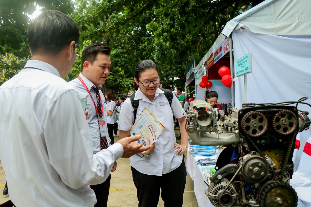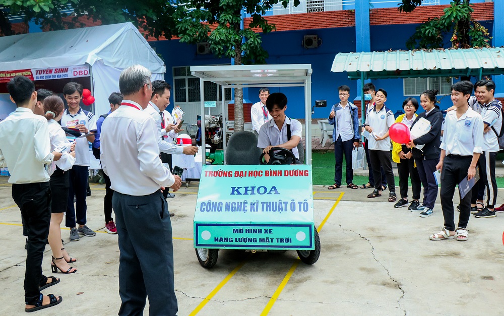 Đặc biệt, tại gian hàng của Trường Đại học Bình Dương, các bạn học sinh đã có dịp trải nghiệm và tự lái thử xe ôtô chạy bằng năng lượng mặt trời do sinh viên Khoa Công nghệ kỹ thuật ô tô Nhà trường sáng chế.