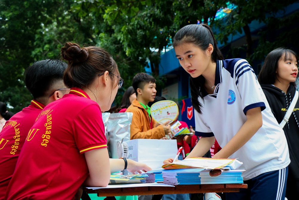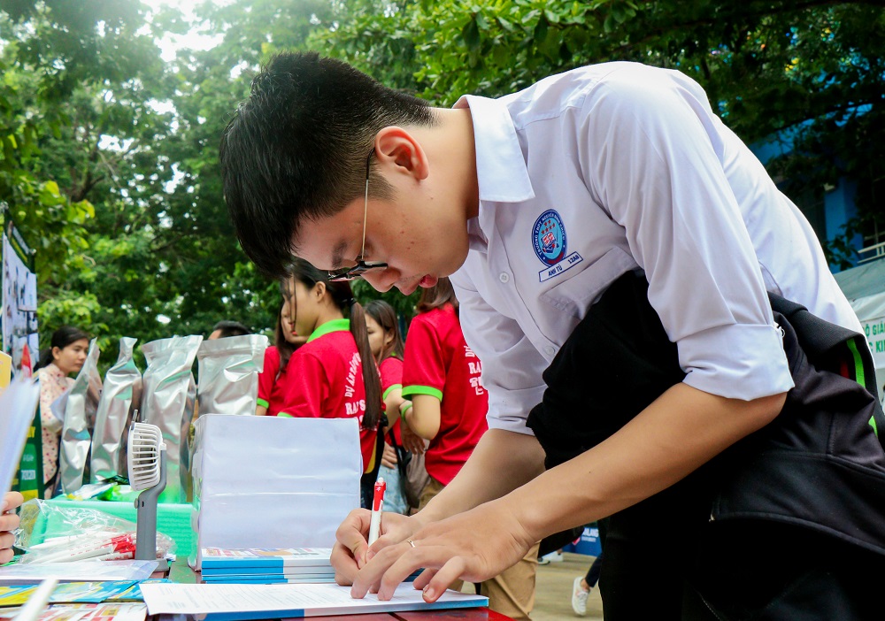 Các em học sinh tham quan, đăng ký thông tin tại gian hàng của Nhà trường