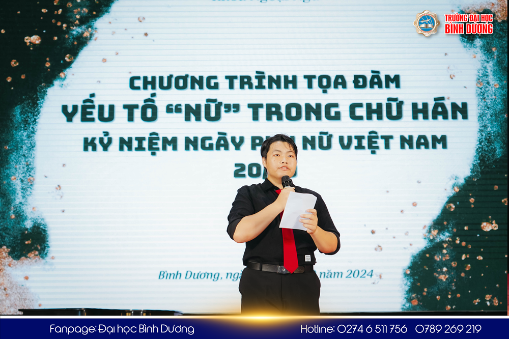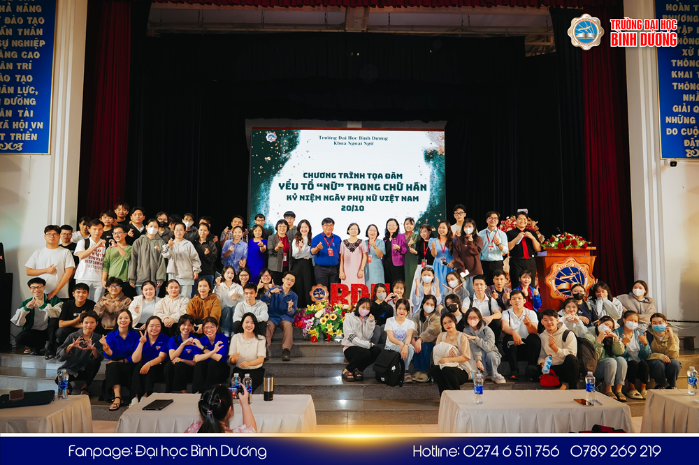 Nhân kỷ niệm 94 năm Ngày Phụ nữ Việt Nam 20/10, sáng ngày 19/10, Khoa Ngoại Ngữ - Trường Đại học Bình Dương tổ chức chương trình tọa đàm học thuật với chủ đề "Yếu tố “Nữ” trong chữ Hán." Chương trình nhằm tạo diễn đàn trao đổi học thuật, kết nối các giảng viên, nhà nghiên cứu, sinh viên và những người quan tâm đến lĩnh vực ngoại ngữ, đồng thời tôn vinh vai trò của phụ nữ trong văn hóa và giáo dục.