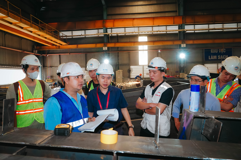 Để giúp sinh viên hiểu rõ hơn về quy trình sản xuất kết cấu thép, đại diện của doanh nghiệp đã dẫn sinh viên tham quan các khu vực xưởng cắt thép, gia công chế tạo, xưởng sơn tĩnh điện, và bãi lắp ráp thử các cấu kiện thép. Trong suốt chuyến tham quan, Ban lãnh đạo Nhà máy đã giải đáp nhiều câu hỏi của sinh viên, giúp các bạn hiểu sâu sắc hơn về ngành nghề mà mình đang theo đuổi.