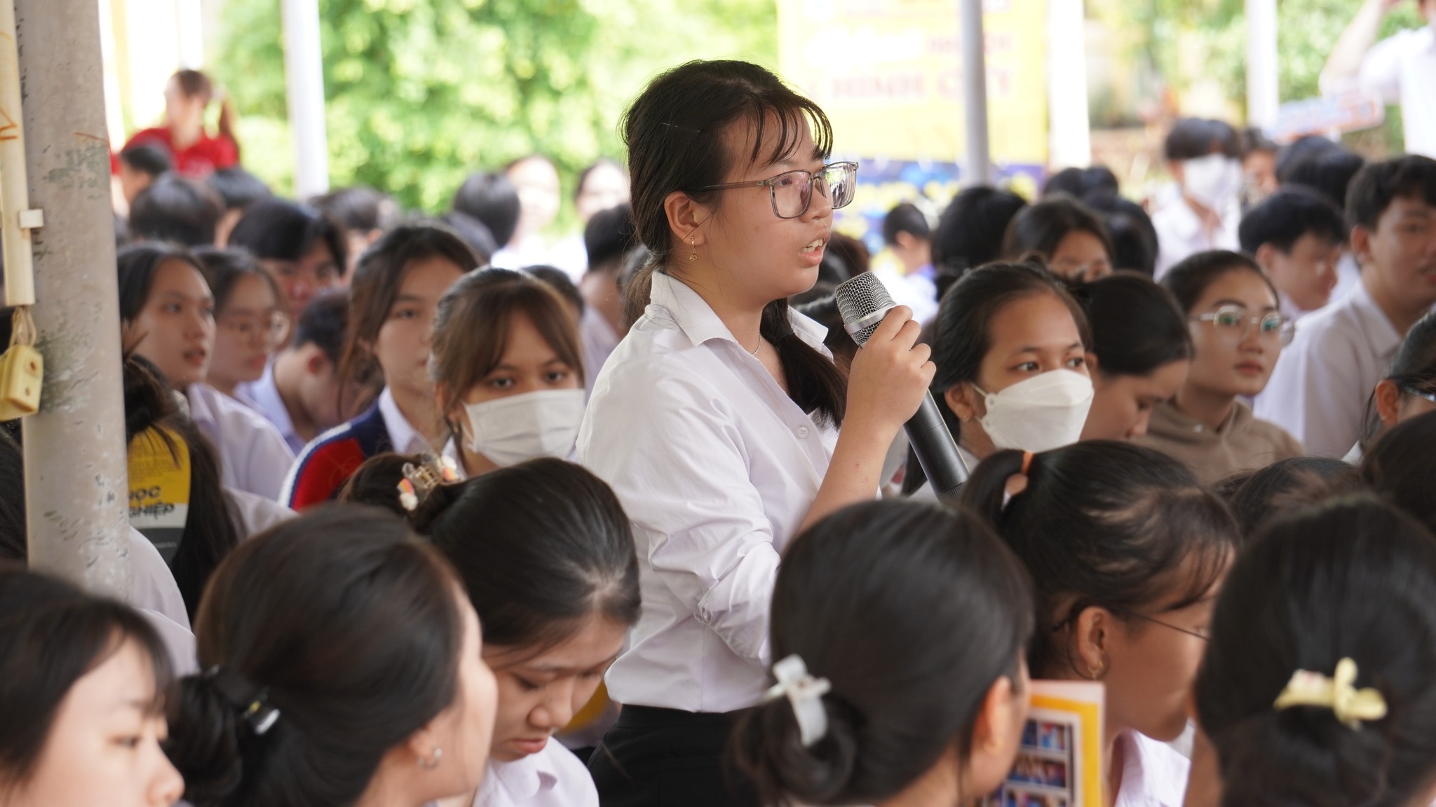 Tiến sĩ Đỗ Đoan Trang - Phó Hiệu trưởng thường trực Nhà trường tư vấn cho học sinh tại sự kiện.