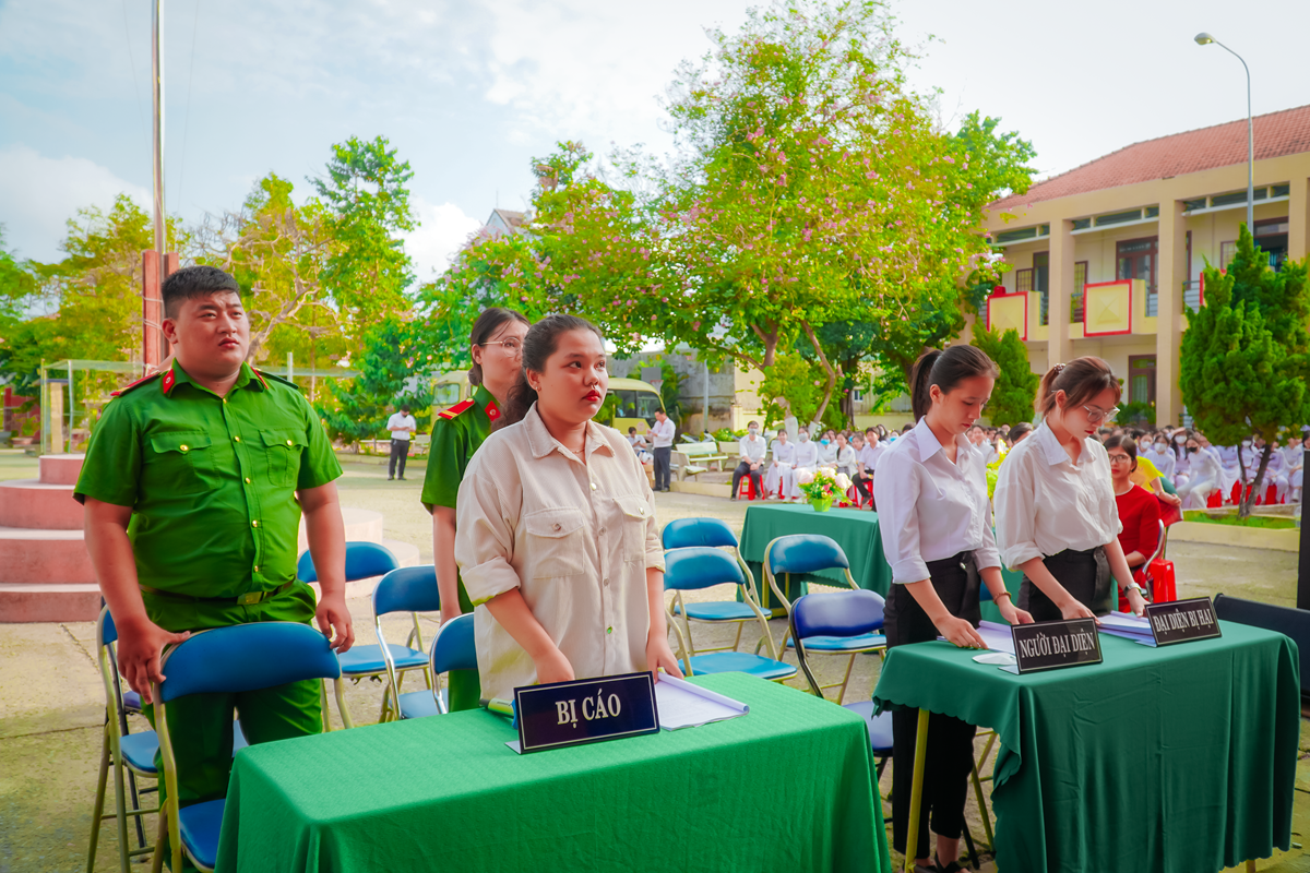 Phiên tòa giả định đã diễn ra với đầy đủ thành phần, trình tự và thủ tục theo quy định của Bộ luật Tố tụng hình sự. Các điều luật được áp dụng trong tình huống giống như phiên tòa thực tế. Từ Hội đồng xét xử đại diện Viện Kiểm sát nhân dân, thư ký phiên tòa đến bị cáo, bị hại…đều do các cán bộ, nhân viên của Tòa án nhân dân, Viện Kiểm sát nhân dân phối hợp với lực lượng đoàn viên thanh niên của Khoa Luật học nhập vai, thể hiện đúng chức năng, nhiệm vụ của mình trong phiên tòa xét xử, đảm bảo tính nghiêm minh của pháp luật.