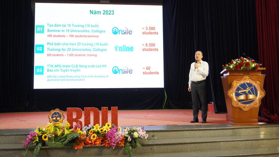 Nhằm giúp cán bộ, giảng viên và sinh viên Trường Đại học Bình Dương nhận thức đầy đủ hơn về năng suất, chất lượng cũng như vận dụng kiến thức đó vào thực tế; góp phần nâng cao chất lượng công việc của viên chức, hiệu quả việc học tập và rèn luyện của sinh viên trong quá trình học tập tại Trường. Sáng ngày 11/5/2024, Trường Đại học Bình Dương phối hợp cùng với Tổng cục Tiêu chuẩn Đo lường Chất lượng tổ chức chương trình Tọa đàm “Tổng quan về Năng suất chất lượng và áp dụng năng suất chất lượng trong các Trường đại học, cao đẳng”.