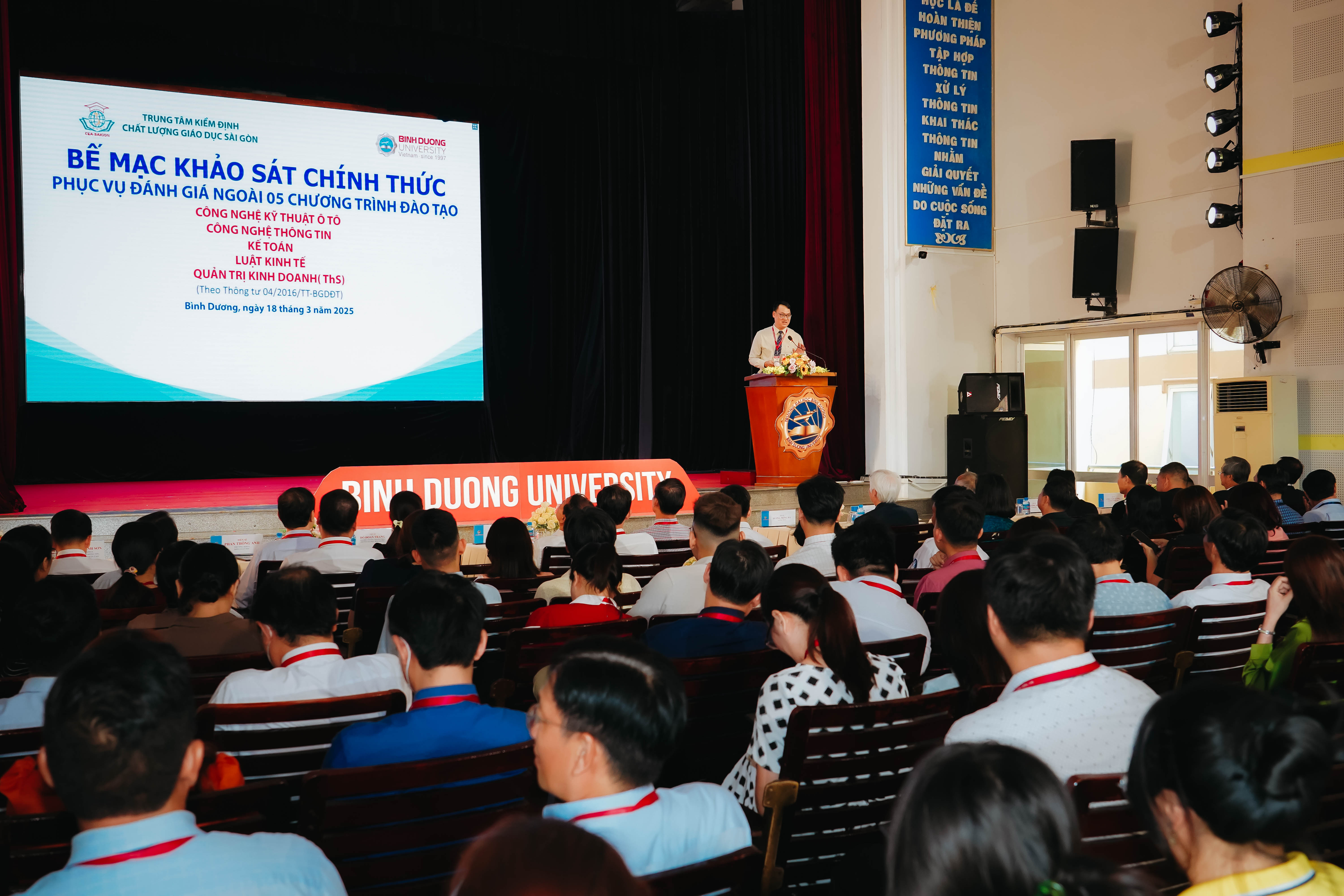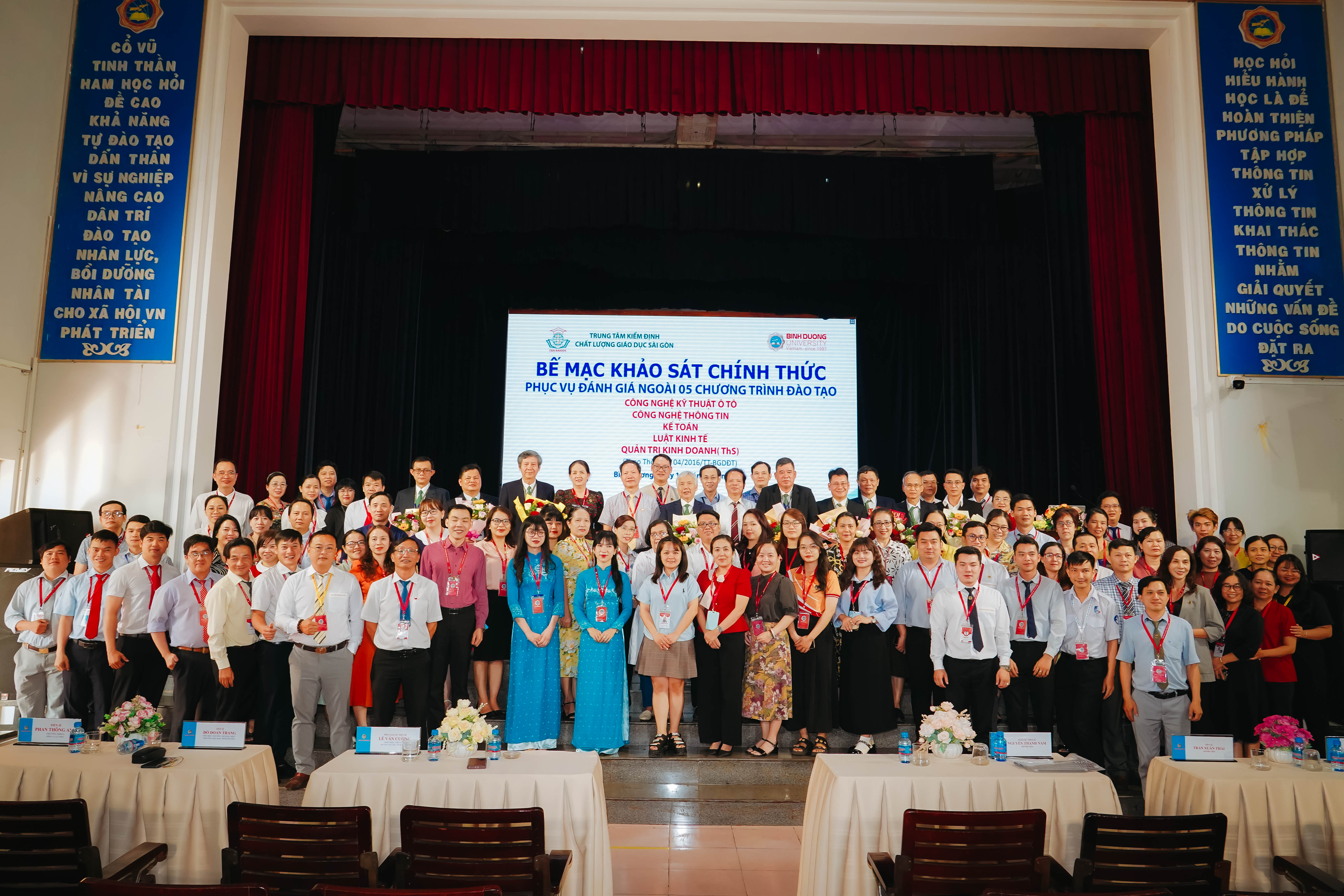 Chiều thứ Ba ngày 18 tháng 3 năm 2025, Ban Giám hiệu Trường Đại học Bình Dương (Trường) phối hợp với Trung tâm Kiểm định chất lượng giáo dục Sài Gòn (CEA-SG) tổ chức Bế mạc đợt khảo sát chính thức phục vụ hoạt động kiểm định chất lượng 05 chương trình đào tạo của Trường; bao gồm 04 chương trình trình độ đại học (các ngành Công nghệ Kỹ thuật ô tô, Công nghệ Thông tin, Kế toán, Luật kinh tế) và 01 chương trình trình độ thạc sĩ (ngành Quản trị Kinh doanh).